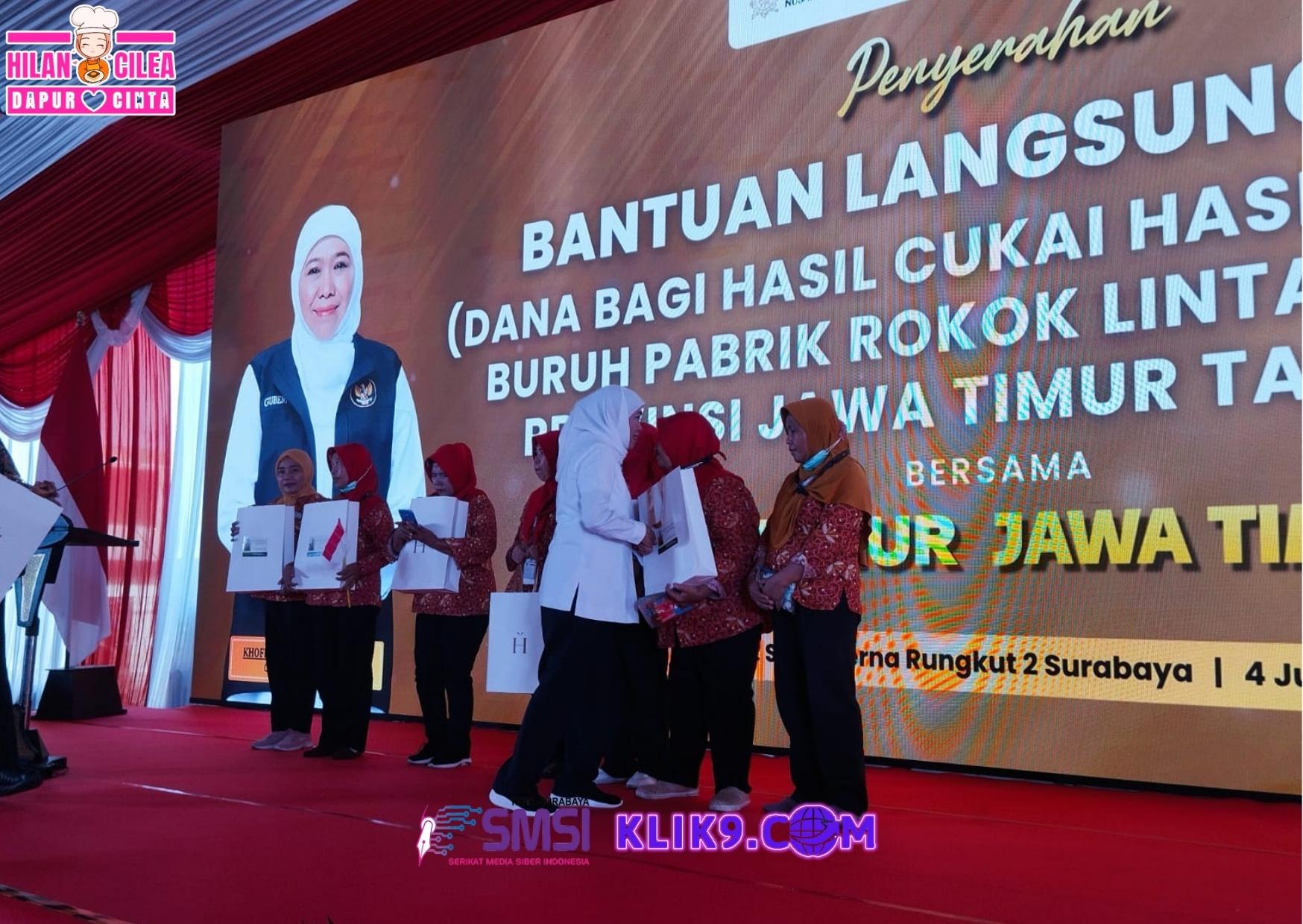 SURABAYA – Gubernur Jatim, Khofifah Indar Parawansa menyerahkan bantuan langsung tunai (BLT) dana hasil cukai hasil tembakau (DHCHT)