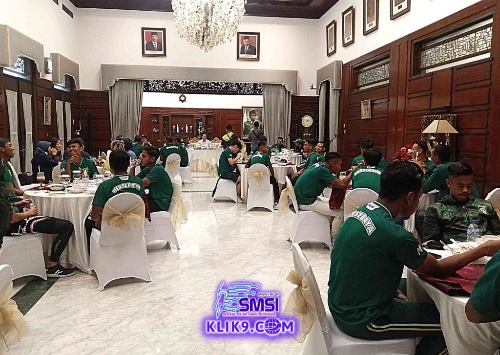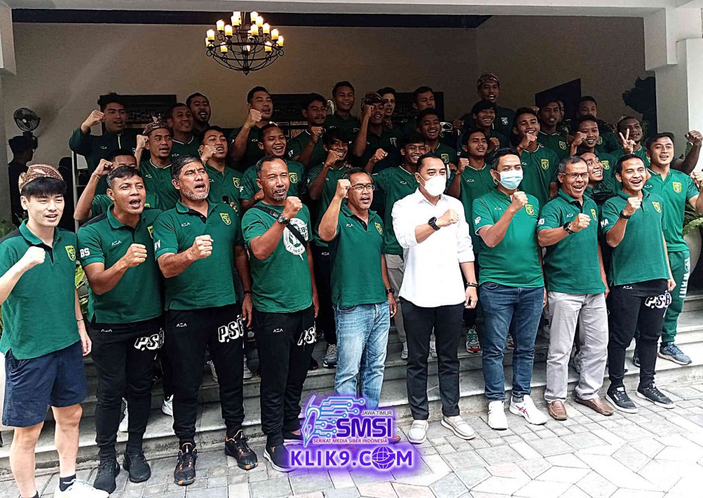 WANI: Wali Kota Surabaya Eri Cahyadi (putih) bersama skuat Persebaya usai jamuan makan, Minggu (2/1/2022) siang di Kediaman Wali Kota, Jalan Sedap Malam, Surabaya. (KLIK9/HARUN)