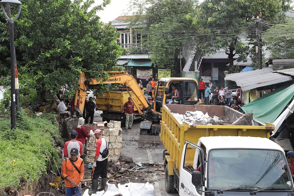 SURABAYA (Klik9.com) – Pemkot Surabaya bergerak cepat memperbaiki pelapis tanggul sungai yang jebol, Jumat (28/4/2023) siang di kawasan Kembang Kuning, Surabaya.
