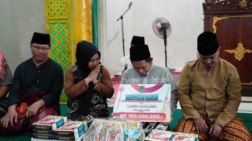 SAFARI RAMADAN: Ning Ita Wali Kota Mojokerto menyerahkan dana hibah kepada pengurus Masjid Jabal Nur Kelurahan Wates. (K9/KOMINFO)