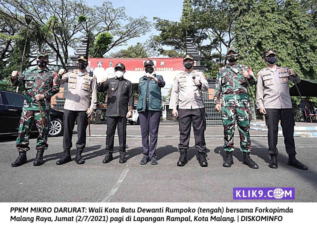 MALANG, Klik9com – Menyambut pemberlakuan PPKM Mikro Darurat, Sabtu besok, Malang Raya (Pemkot Malang, Pemkab Malang dan Pemkot Batu) menggelar apel pasukan gabungan penebalan pelaksanaan operasi Covid-19, Jumat (2/7/2021) pagi di Lapangan Rampal, Kota Malang.