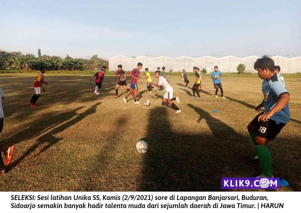 SIDOARJO (Klik9.com) – Pada pekan kedua latihan Unika Soccer School (Unika SS) Kamis (2/9/2021) sore di Lapangan Banjarsari, Buduran, Sidoarjo, mulai diikuti sejumlah pemain muda bertalenta.