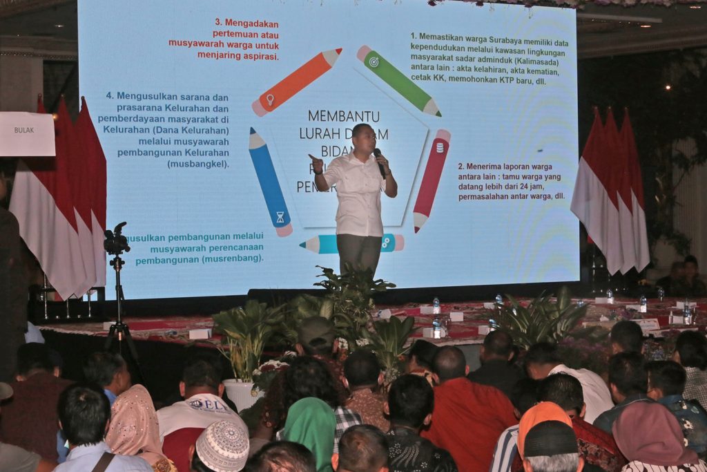 SURABAYA (Klik9.com) – Wali Kota Surabaya Eri Cahyadi mengumpulkan 3000 Ketua RT, RW, dan Lembaga Pemberdayaan Masyarakat Kelurahan (LPMK) di Ballroom Gedung Empire Palace, Selasa (14/2/2023). Seperti pada pertemuan sebelumnya, ia memberikan arahan dan masukan kepada seluruh Ketua RT, RW, dan LPMK agar bekerja sesuai amanah.
