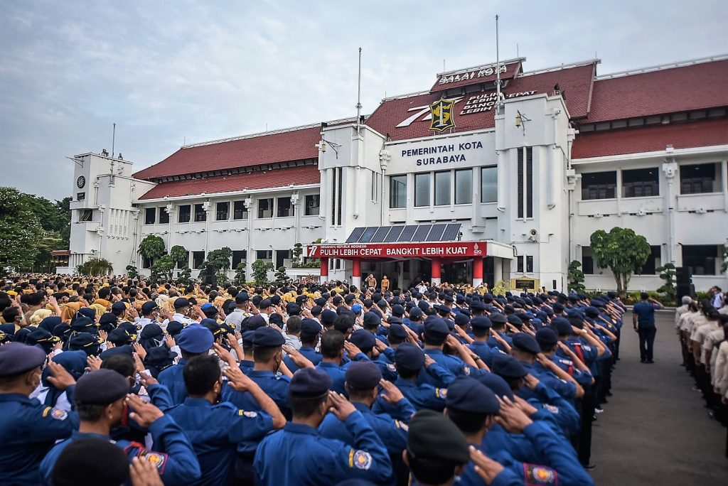 PAM SWAKARSA: Apel pengamanan bersama lebaran 2023 di Balai Kota Surabaya. (K9/IST)