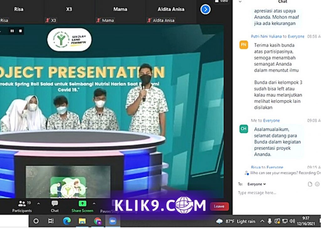 Di tahap akhir proyek, selama tiga hari, Rabu-Jumat (15-17/12) siswa yang terbagi 16 kelompok melakukan presentasi bergantian di hadapan para orang tua dan panelis secara hybrid, yaitu presentasi yang menggabungkan teknik tatap muka (face to face) dengan siswa yang presentasi di sekolah dan nontatap muka (online) dengan orang tua yang bergabung dalam Zoom mengikuti dari rumah atau kantor.