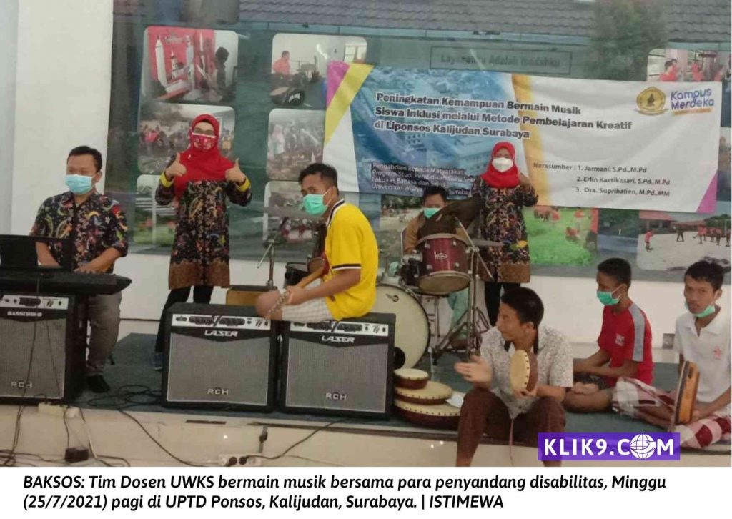 SURABAYA, Klik9com – Tim Dosen Universitas Wijaya Kusuma Surabaya (UWKS) untuk kesekian kalinya kembali memberikan motivasi dan pelatihan musik kreatif kepada anak-anak penyandang disabilitas di UPTD Ponsos, Kalijudan, Surabaya, Minggu (25/7/2021) pagi.