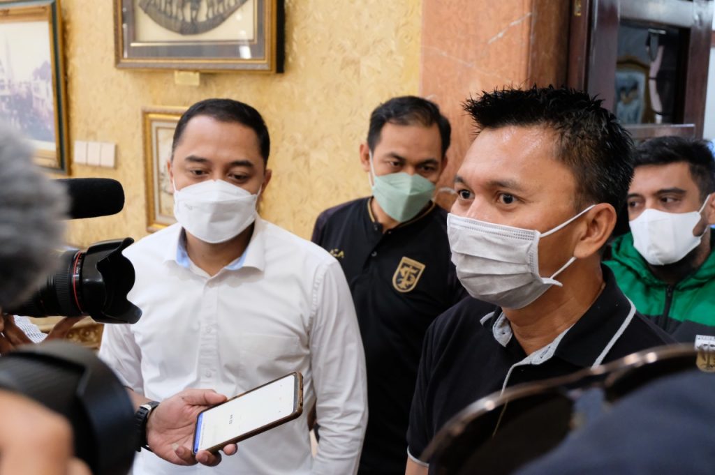 Klik9.com – Wali Kota Surabaya Eri Cahyadi menyambut dengan hangat silaturahmi manajemen Persebaya dan panitia Bromo KOM di ruang kerja Wali Kota Surabaya, Balai Kota Surabaya, Senin (18/4/2022). Di ruang kerja itu, mereka nampak diskusi dengan gayengnya sembari membahas soal Persebaya hingga mematangkan trofeo Wali Kota Surabaya.