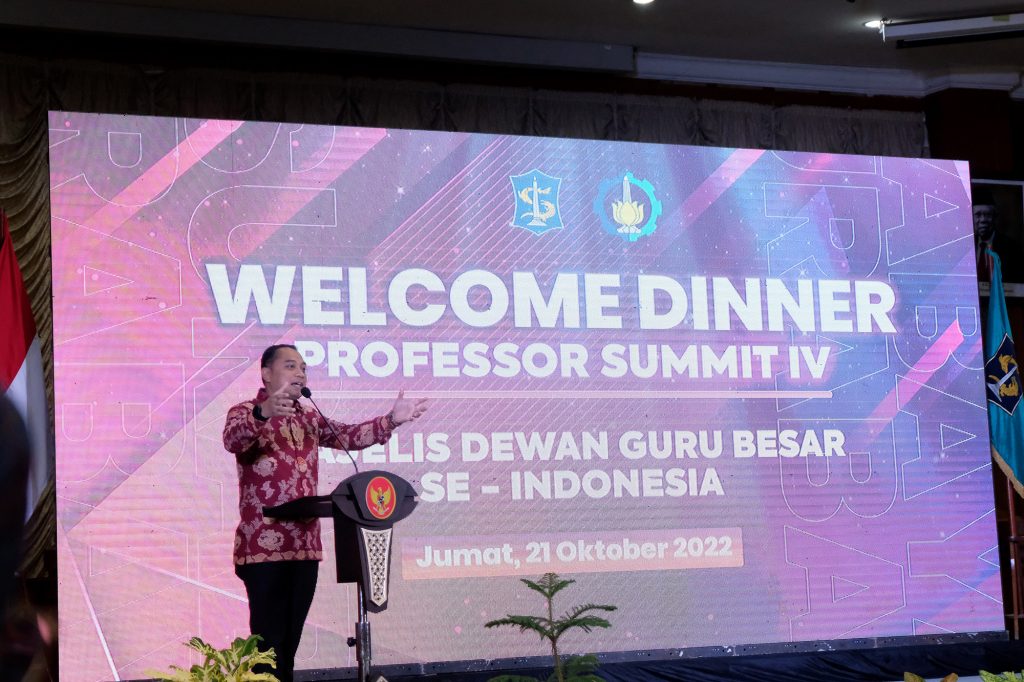 SURABAYA (Klik9.com) – Wali Kota Surabaya Eri Cahyadi menyambut hangat kehadiran para peserta Professor Summit IV Institut Sepuluh Nopember (ITS) Kota Surabaya dari Majelis Dewan Guru Besar se – Indonesia di Gedung Sawunggaling Pemerintah Kota (Pemkot) Surabaya, Jumat (21/10/2022). Pada kesempatan itu, Wali Kota Eri Cahyadi juga memaparkan capaian pengentasan kemiskinan dan pengangguran di Kota Surabaya kepada para peserta Professor Summit IV.